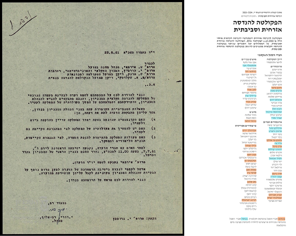 מעניין שבהכנות לקראת הכתבה מצאנו בארכיון הטכניון ש"הנדסה חקלאית" עסקה בשאלה "פנינו לאן" כמעט מיומה הראשון. הנדסה חקלאית נוסדה ב 1953, וכבר בשנת 1961 מינה נשיא הטכניון דאז, רב אלוף יעקב דורי, וועדה שהתבקשה לעסוק בשאלת מעמדה של המחלקה להנדסה חקלאית (ראו צילום של המכתב המקורי). הפקולטה עברה את המשבר ופרחה בשנות השבעים והשמונים. במהלך שנות התשעים חלה ירידה בחשיבות הכלכלית של החקלאות בארץ, התנועה הקיבוצית וההתיישבות העובדת נעשו פחות אטרקטיביות, וחלה ירידה במספר הסטודנטים בהנדסה חקלאית.